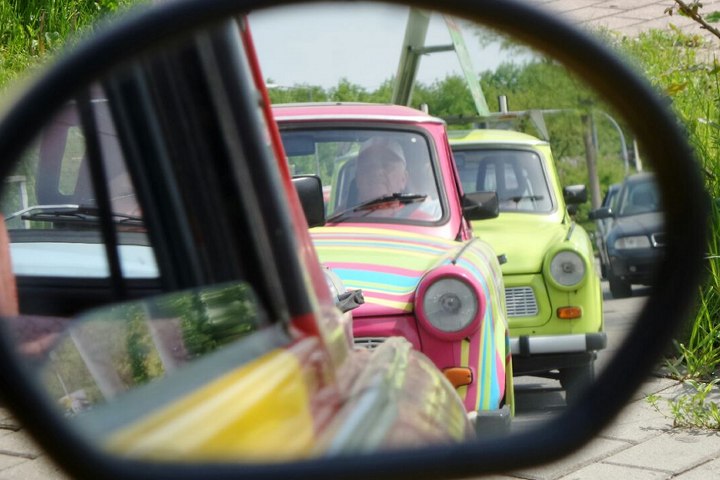 Am Sonntag Vormittag machten wir uns dann mit Bus & Bahn auf den Weg zu unseren gebuchten Trabis. Cathy & Heike "bewachten" den Platz und chillten. Was für ein schöner Anblick auf dem Trabigelände. Claus 0206, Thomas 1704 und Helmut 0008 schnappten sich eine Pappe - gut überlegt? Nach einer Einweisung und nach dem sich ein jeder in die Plastekisten gequetscht hat, ging das Abenteuer los.