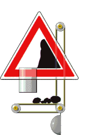 Die nebenstehende Abbildung zeigt, wie wir das Verkehrszeichen "Steinschlag" verwirklicht haben. Auch hartnäckige Kritiker werden neidlos anerkennen müssen, dass es sich hierbei nicht um eine nutzlose Computeranimation, sondern um einen technischen Geniestreich handelt.
